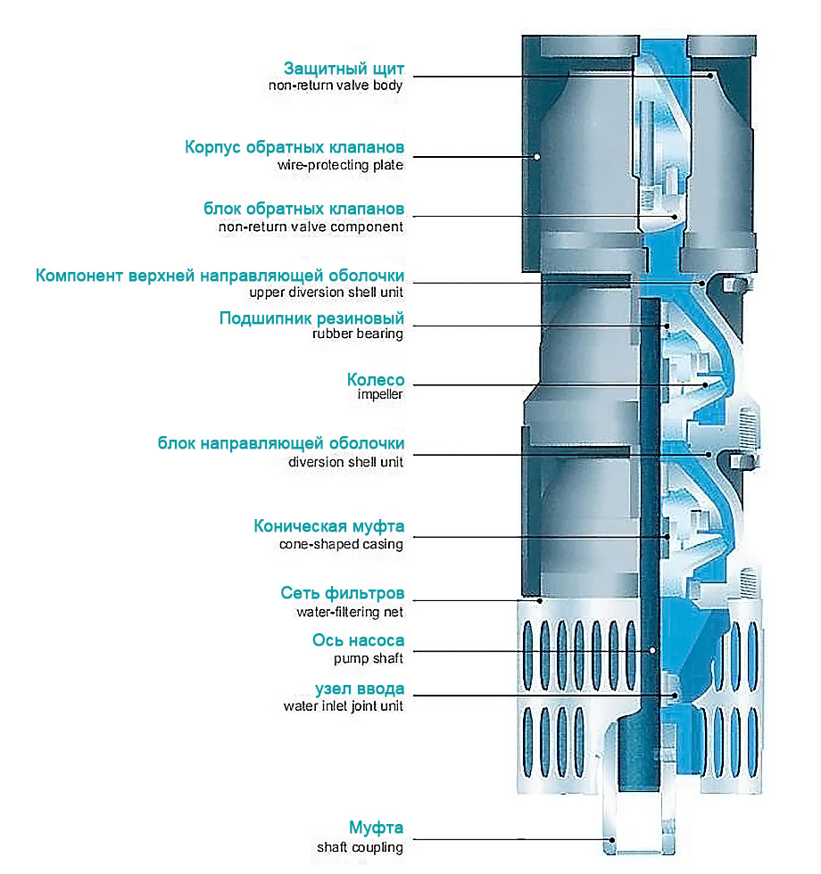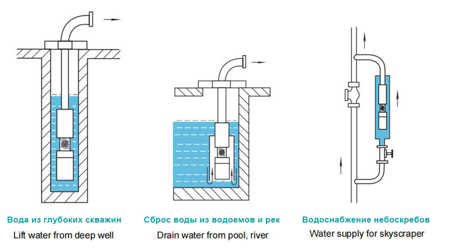 Direct integration into the kit, work in deep water. Mainly used for irrigation of agricultural land, water supply and sewerage of cities, industrial and mining enterprises.