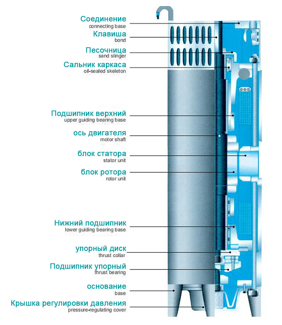 2. The submersible motor uses YQS type water-filled wet design, filled with clean water in the cavity, mainly for cooling the motor and lubricating the bearings. During operation, since changes in temperature may cause changes in water filling, pressure regulators are installed in the engine for calibration.