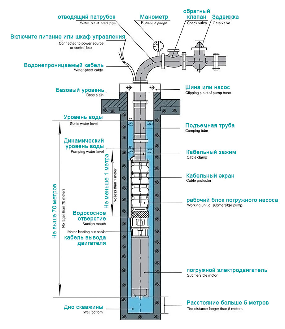 1. The underwater electric pump is composed of five parts: water pump, motor, water line, waterproof cable and control switch. The pumps are single-suction multistage vertical centrifugal three-cylinder pumps.