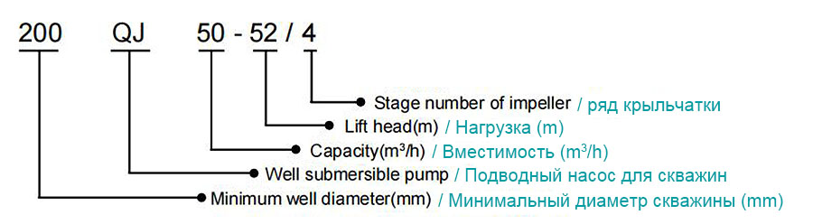 Model Minimum well diameter (mm) QJ (flow rate (m3/h) - flow pressure (m)/impeller level |