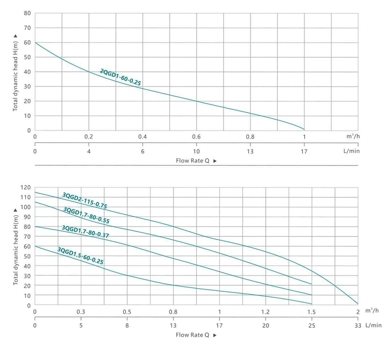 | 3QGD1.5-60-0.25 | 0.25 | 0.33 | H(m) | 60 | 45 | 30 | 20 | 12 | 9 | 1 | |||||