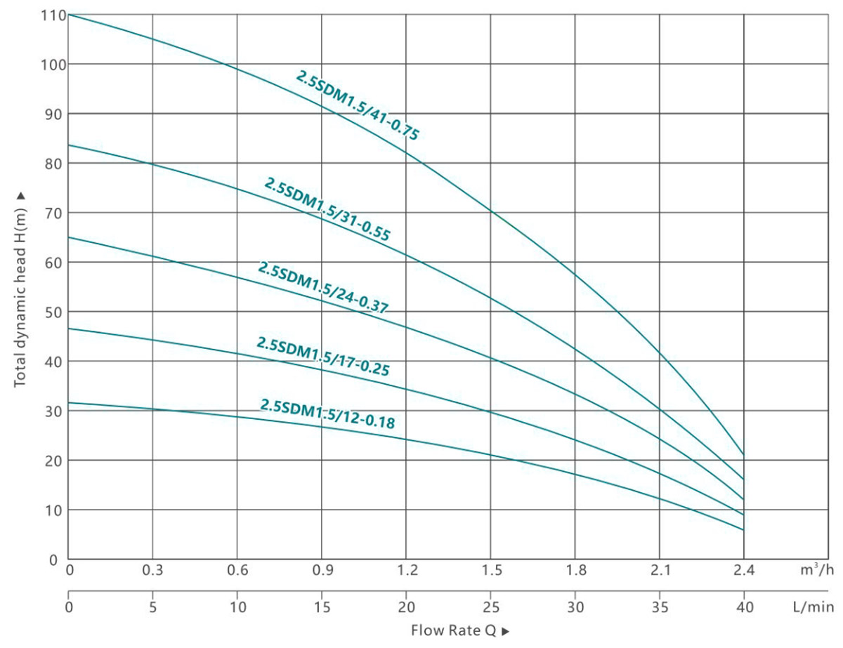 | 2.5SDM 1.5 / 12-0.18 | 2.5SD1.5 / 12-0.18 | 0.18 | 0.25 | H(m) | 32 | 30 | 28 | 26 | 24 | 21 | 17 | 13 | 6 |