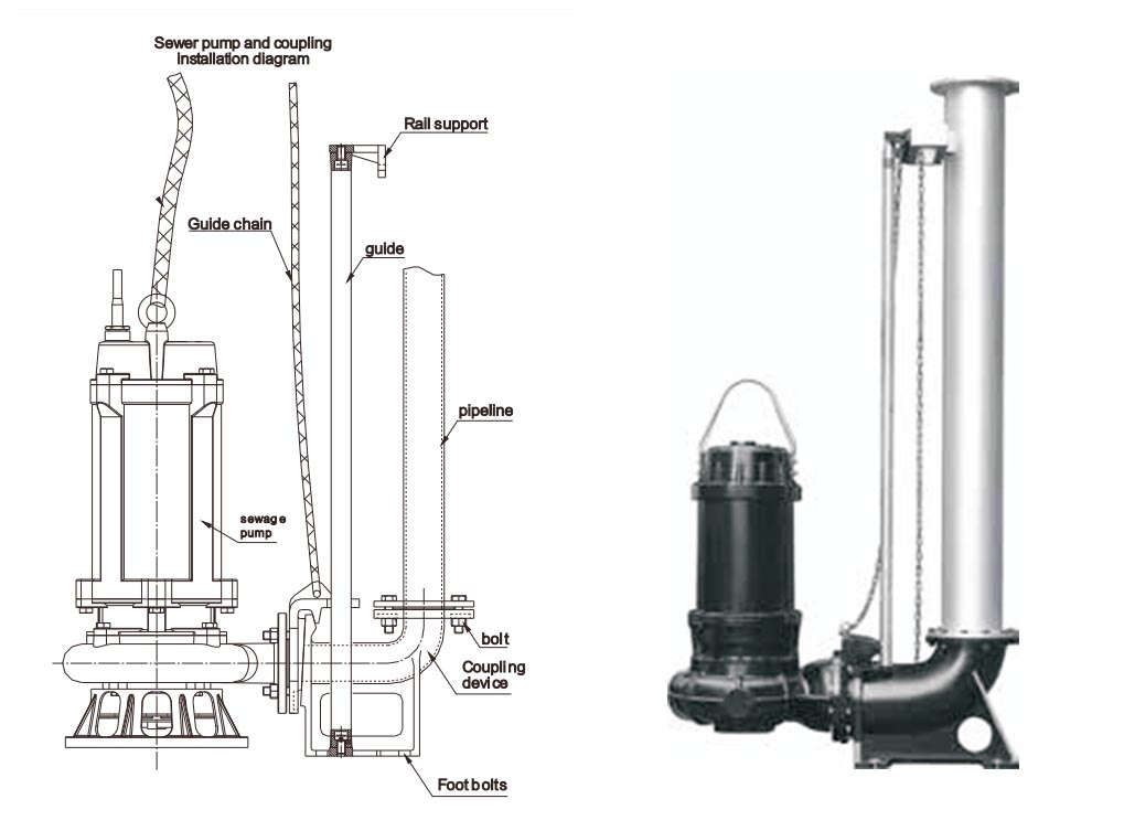 • The guide mounting system simply reduces and raises the pump to easily connect the pump to the pipeline, without entering the sump pit for easy maintenance and inspection.