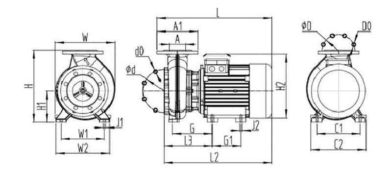 L (mm) | L2 (mm) | L3 (mm) | H (mm) | H1 (mm) | H2 (mm) | W (mm) | W1 (mm) | W2 (mm) | J1 (mm) | C1 (mm) | C2 (mm) | J2 (mm) | G (mm) | G1 (mm) | A1 (mm) | A (mm) | d (mm) | D (mm) | D0 (mm) |