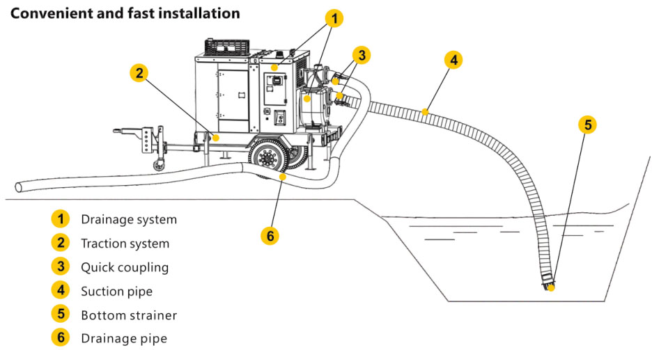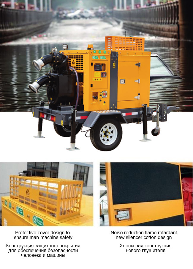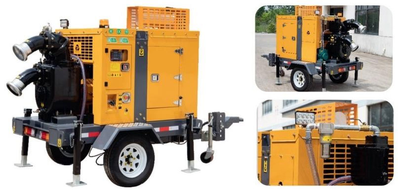 ZEN Machinery high quality PV Type Trailer Diesel Engine Pump is suitable for field drainage without electricity; built-in vacuum amplifier system, no need to fill the pump body with water. It can start draining quickly after start; system for road trailer, speed: 40 - 80 km/h; built-in fuel tank on chassis, can operate for 8 - 10 hours.