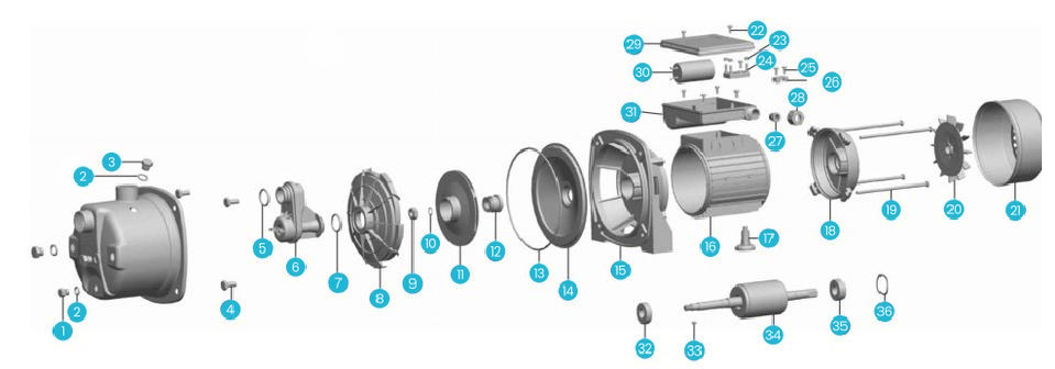 | 2 | "O" Ring | 14 | Pump housing cover | 26 | Cable press | ||||||