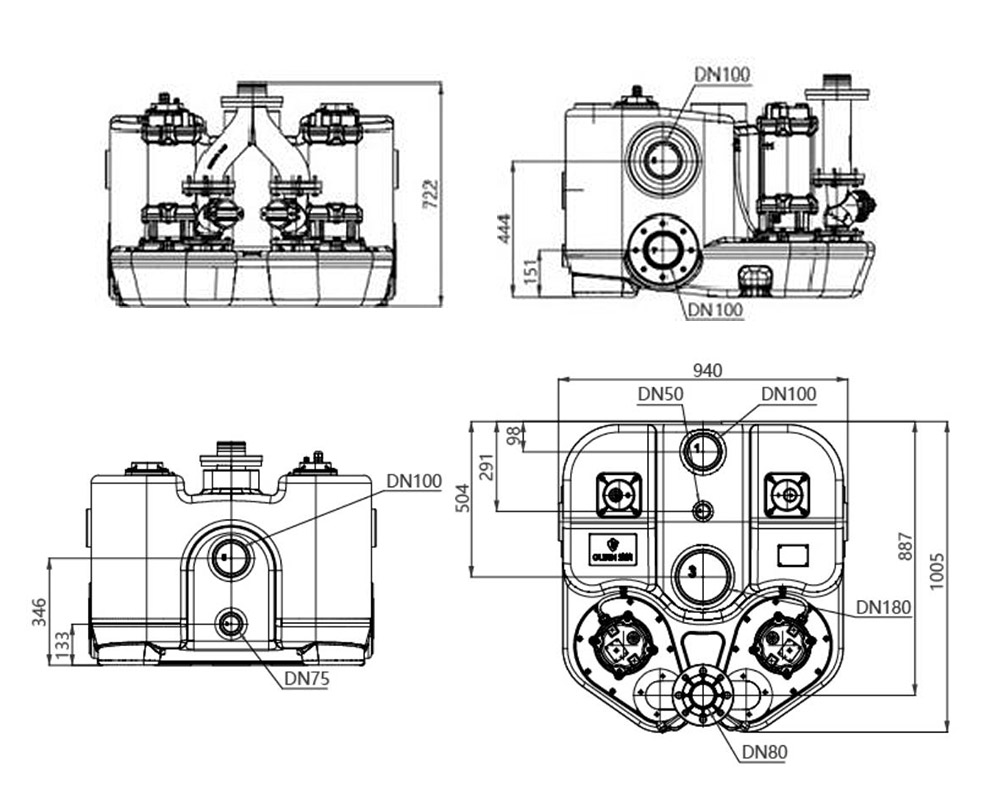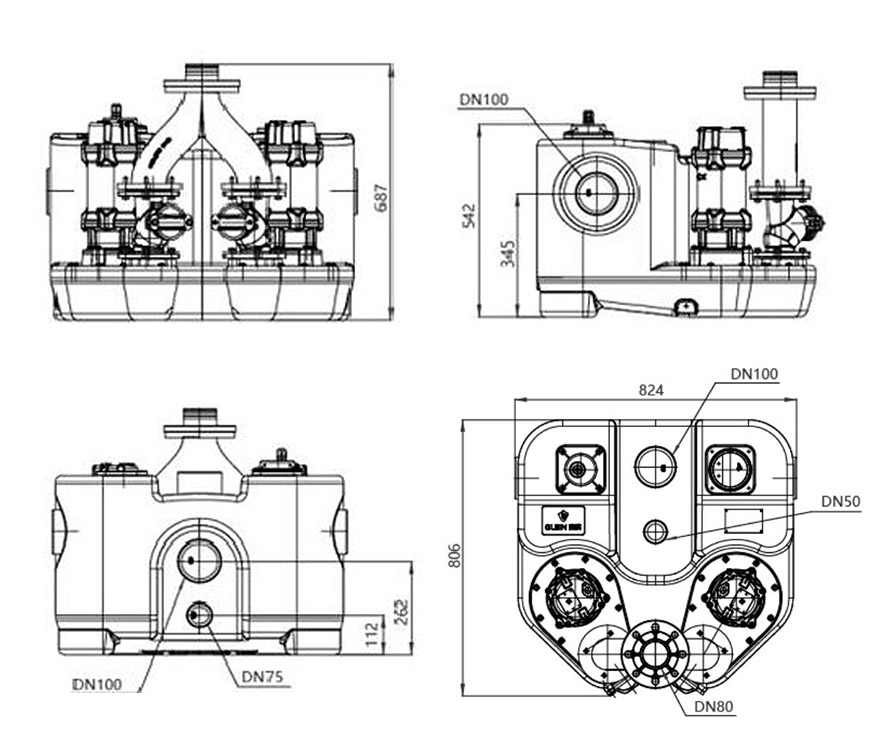 WL - 180L has four water intake openings DN100, one water intake or maintenance hatch DN75 and one outlet DN80. The top part is equipped with a DN50 exhaust port. Water level control is carried out using a double floating ball sensor, which can be selected with a pressure sensor. Customizing the wall hanging control box with Chinese LED screen can realize more functions such as motor protection and fault warning.