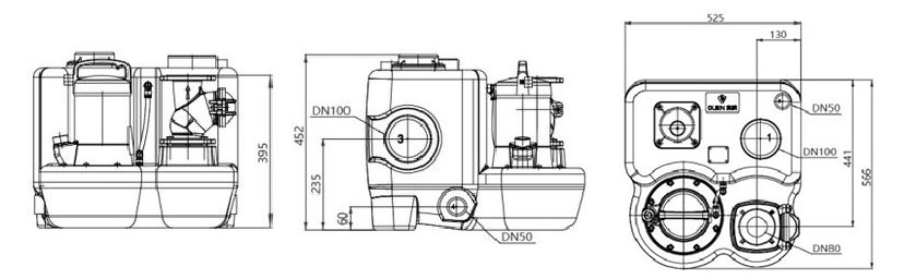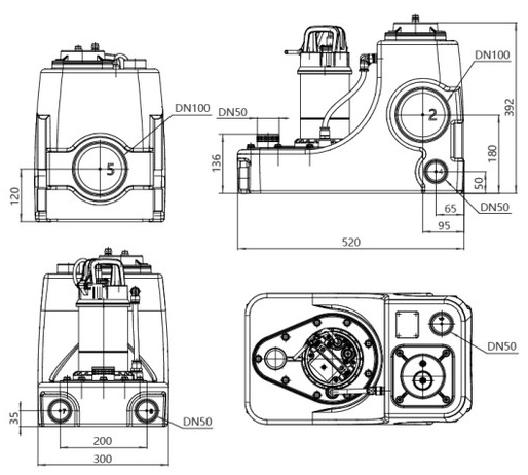 The WL 40L-500L Sewage Pump Lifting Station has three DN100 water inlet openings, four DN50 water inlet or maintenance openings, and one DN50 outlet.