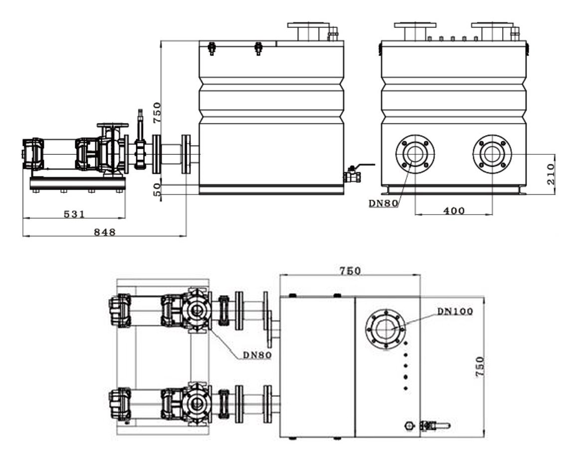 WL - 300L has three water intakes DN100, two water intake or repair openings DN50 and one outlet DN80. The top part is equipped with a DN50 exhaust port. Water level control is carried out using a double floating ball sensor, which can be selected with a pressure sensor. Customizing the wall hanging control box with Chinese LED screen can realize more functions such as motor protection and fault warning.