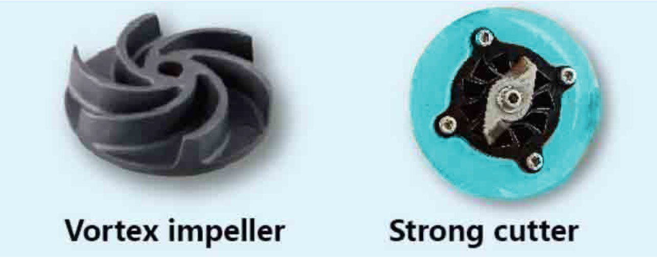 Characteristics 1. Vortex semi-open impellers, allowing passage of large physical dimensions. 2. Knife and ring material: 420 high chromium stainless steel, hardness HRC49 - 52, good wear resistance. |