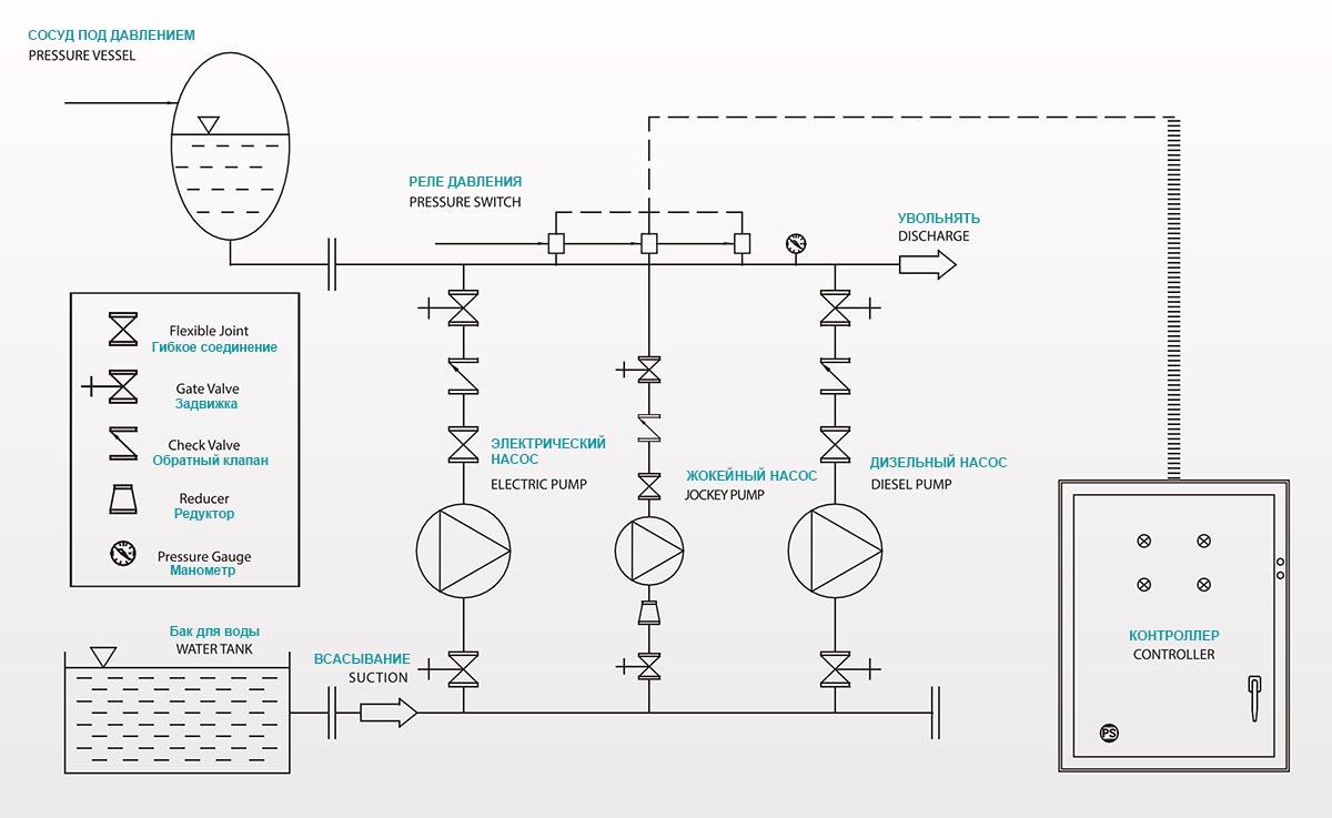 When pressure drops below the set value, jockey starts running with the signal from the pressure switch and continues running for 10minutes till the system pressure reaches the set value. If the pressure continues drop, first the main pump starts to run. If the system pressure can't supply and pressure continues drop, the standby pump starts to run.