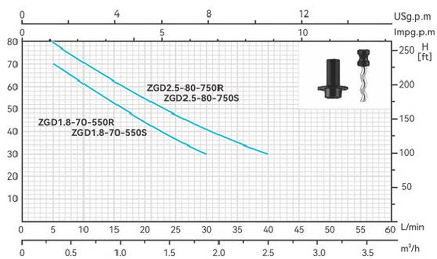 | ZGD1.8-70-550R | 0.55 | 0.75 | H(m) | 75 | 50 | 30 | 20 | 10 | ||||||||