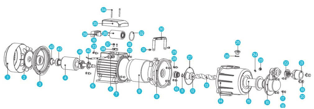 | 10 | Mechanical seal | 21 | Inlet cover | 32 | "O" Ring | 43 | Open ring | |||||||
