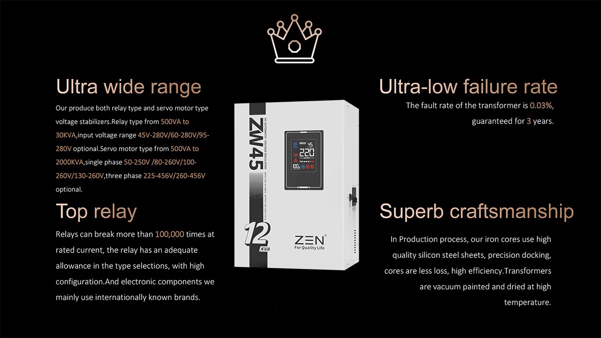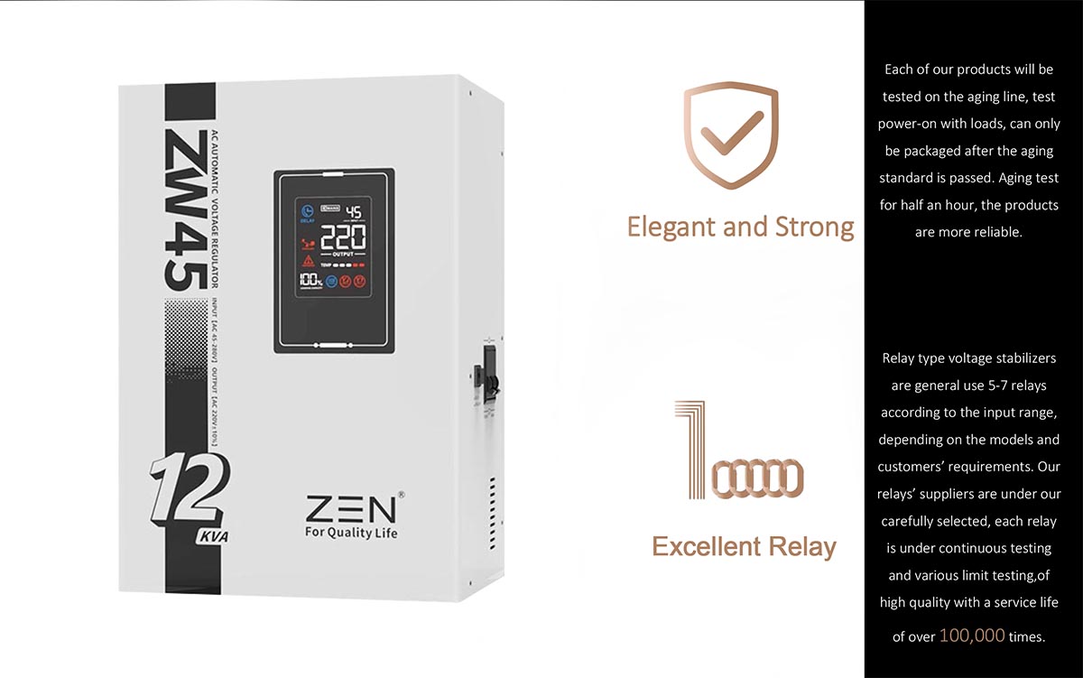 ZW60 1KVA to 30KVA Automatic AC Voltage Regulator is designed for long service life, rugged construction and high-performance components. Product FeaturesThis model is a fully automatic 220V small voltage regulator designed for portable LED digital display. It has the characteristics of small size, light weight, fast voltage adjustment, no waveform distortion and so on.