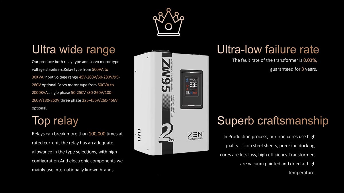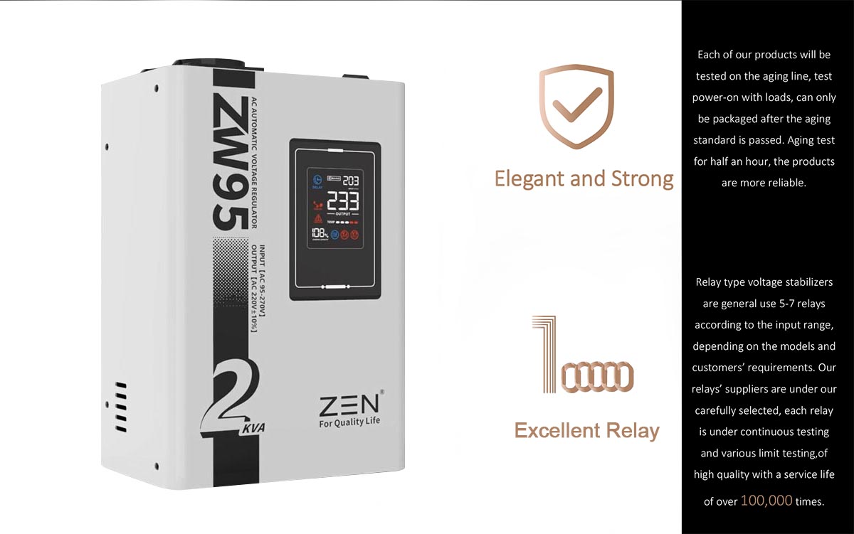 ZEN Machinery factory's high quality ZW95 1KVA to 30KVA Automatic AC Voltage Regulator brands are known for their high quality and reliability, making them a popular choice for both residential and industrial applications. Product FeaturesThis model is a fully automatic 220V small voltage regulator designed for portable LED digital display. It has the characteristics of small size, light weight, fast voltage adjustment, no waveform distortion and so on.