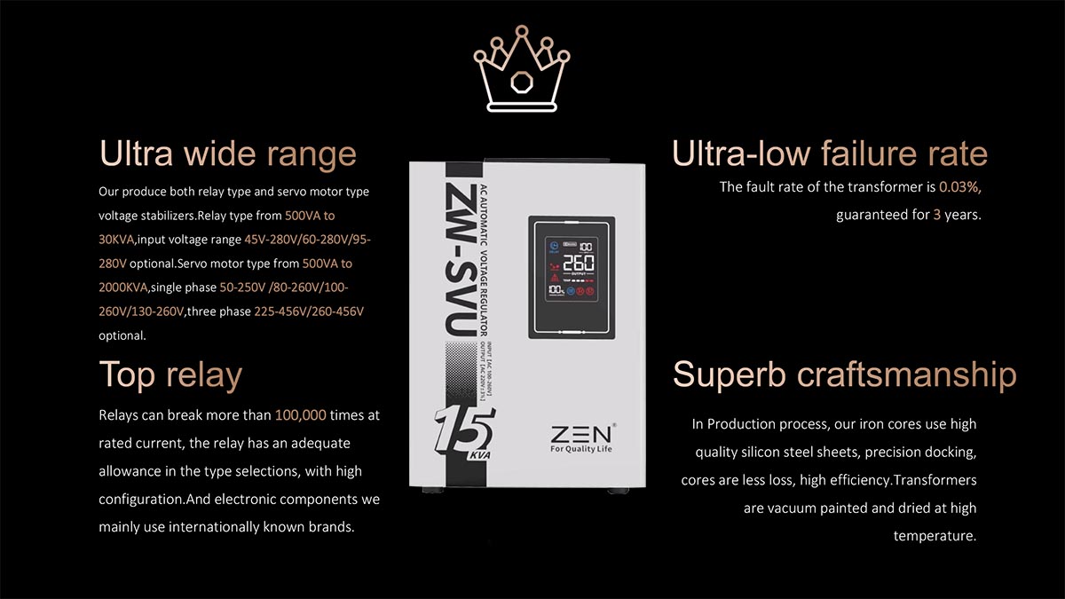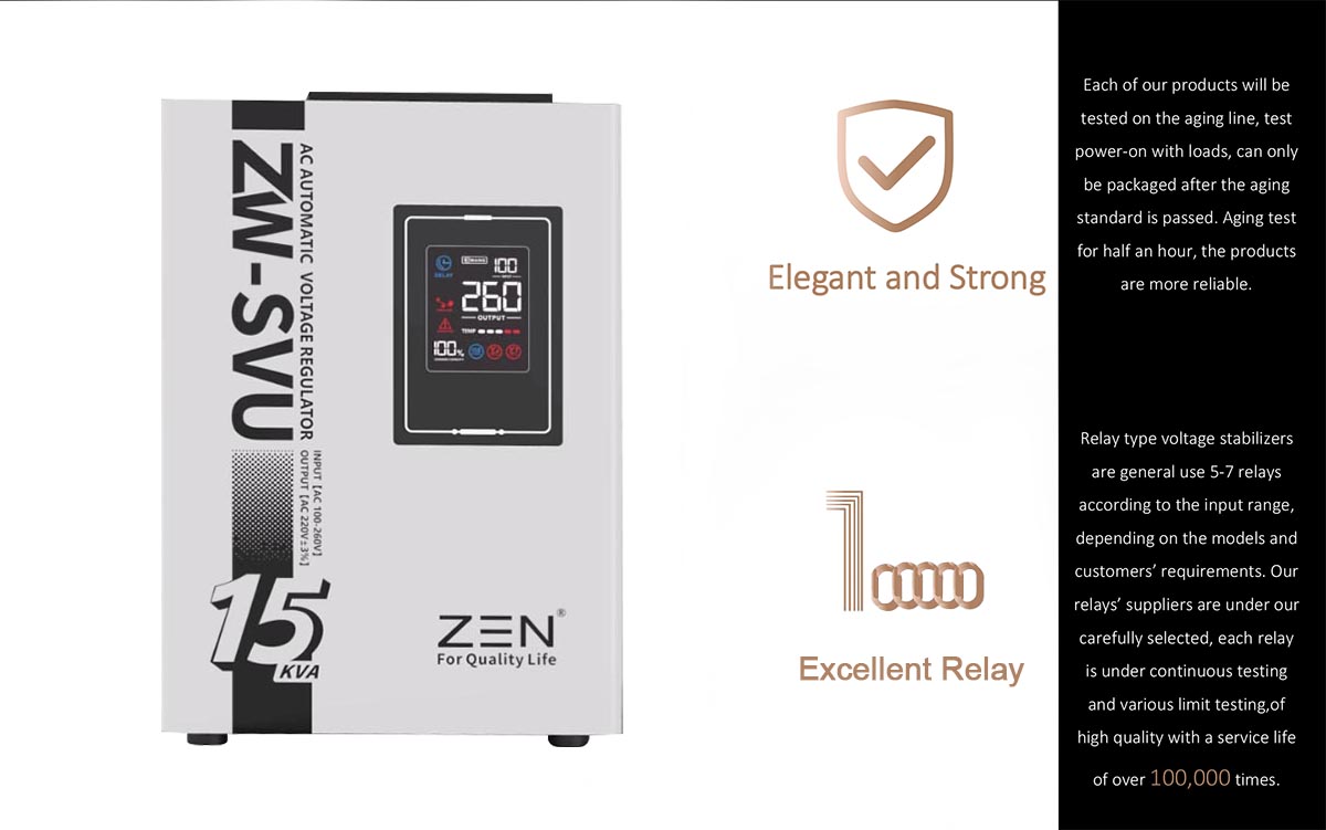 ZEN Machinery factory's high quality ZWSVU 15KVA Automatic AC Voltage Regulator is a famous manufacturer and supplier in China, specializing in producing high quality ZWSVU 15KVA Automatic AC Voltage Regulator. Product FeaturesThis model is a fully automatic 220V small voltage regulator designed for portable LED digital display. It has the characteristics of small size, light weight, fast voltage adjustment, no waveform distortion and so on.